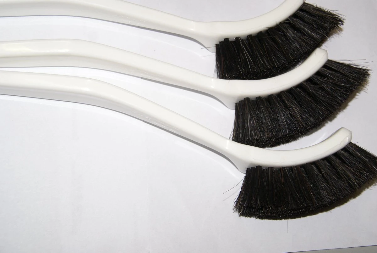 3 plastic afwasborstels met paardenharen. Zwarte haren en witte steel
