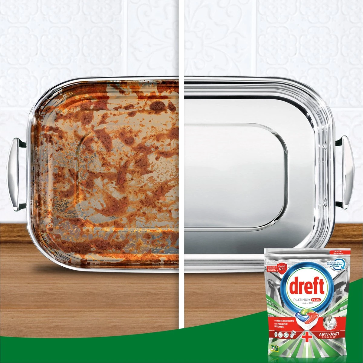 Dreft Platinum Plus All in One vaatwascapsules leveren een zo goed als nieuwe vaat. Ze leveren de beste reiniging van Dreft en helpen zelfs de dofheid die na verloop van tijd is opgebouwd weg te nemen om de oorspronkelijke glans van je vaat te herstellen. Dreft Platinum Plus heeft een geïntegreerd voorwassysteem en doet het voorwasprogramma voor je. Met Dreft Platinum Plus hoef je niet voor te spoelen, zodat je water bespaart en milieuvriendelijker bent. Dreft combineert vloeistof en poeder in één krachtige capsule. Het ultra-oplosbare zakje lost snel op en werkt goed in korte cycli omdat het snel begint te reinigen om de klus klaar te krijgen. En ze zijn gemakkelijk te gebruiken. Plaats ze gewoon in het doseerbakje van je vaatwasser, met verpakking.