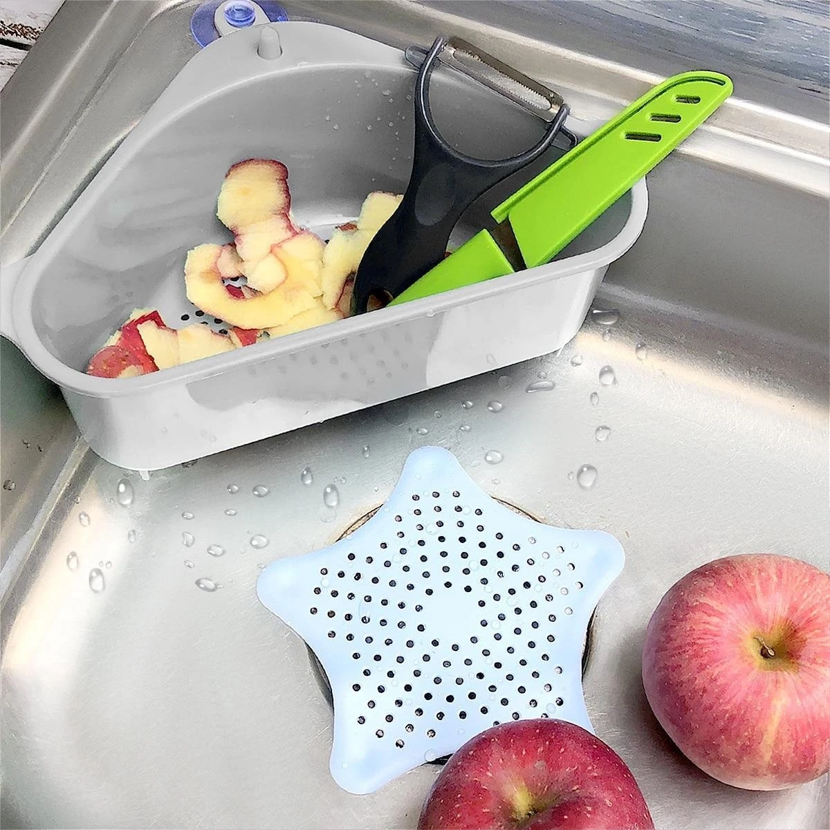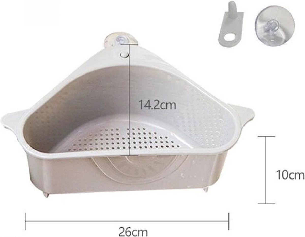 Met dit handige zeefje voor in de gootsteen kunt u voortaan uw aanrecht en gootsteen schoon houden. U kunt hier al uw sponsjes en andere keukengerei kwijt. Het kan gebruikt worden als zeefje met behulp van de filtergaten. Ook geschikt voor tijdens het schillen van groenten en fruit.