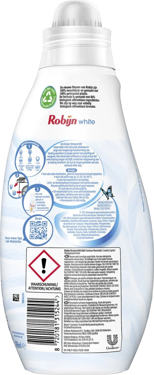De verbeterde Robijn Stralend Wit formule bevat 80% biologisch afbreekbare ingrediënten. We zijn op weg naar volledig biologisch afbreekbare formules. De vertrouwde effectiviteit en bekende geuren van Robijn, gecombineerd met de kracht van de natuur. Goed voor je kleding en beter voor de planeet. Bovendien zijn de flessen gemaakt van 100% gerecycled en 100% recyclebaar plastic. Op deze manier draagt Robijn bij aan een duurzamere manier van wassen.