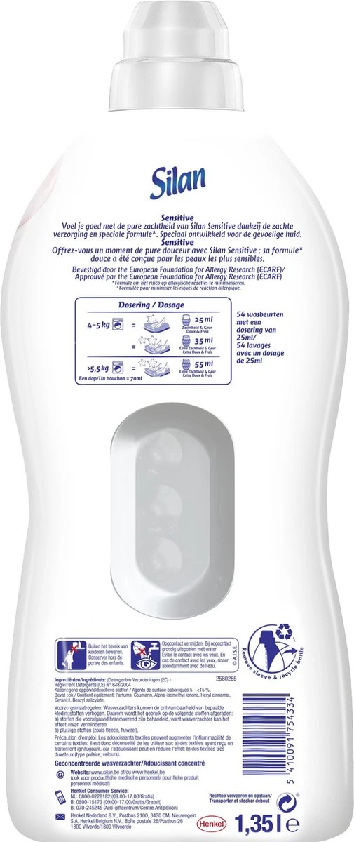 Verwen jezelf, je baby en je familie met de bijzondere zachtheid van Silan Sensitive wasverzachter, onze beste Sensitive wasverzachter tot nu toe. Silan Sensitive wasverzachter is speciaal ontwikkeld voor de gevoelige huid en bevat geen kleurstoffen. Dit maakt Silan Sensitive de beste wasverzachter voor de gevoelige huid, voor het wassen van babykleding en het vermijden van allergische reacties. Daarnaast is de wasverzachter dermatologisch getest. Gebruik Silan Sensitive wasverzachter bij elke wasbeurt en geniet van een langdurige, milde geur en een stralend schone, zijdezachte was. Voel je goed met de pure zachtheid van Silan Sensitive wasverzachter.